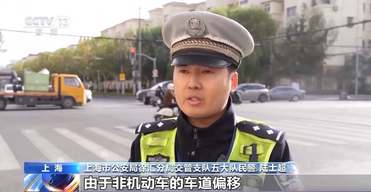 上海市公安局徐汇分局交管支队五大队民警 陆士超:因为车道是划分好的,按照各行其道的原则,非机动车必须走非机动车道,机动车走机动车道。由于非机动车的车道偏移,它进入了机动车道。同时,机动车转弯时已经驶入了车道,这对机动车是没有办法反应的,就造成了一个这样的事故,所以责任划分应该划给非机动车方的。