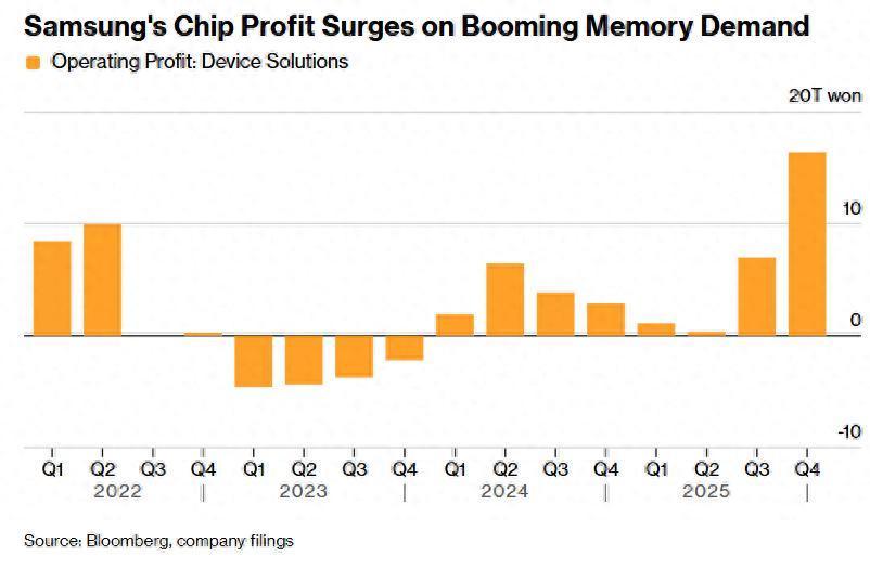 三星公布最新业绩显示,截至12月的三个月该公司芯片业务部门营业利润高达16.4万亿韩元(约合114亿美元),实现同比暴增465%,而分析师们平均预期约为10.85万亿韩元。三星电子“芯片/半导体部门(即Device Solutions,也被称作DC部门,含存储/芯片代工等),其中三星存储芯片业务创下季度营收和营业利润历史新高,主要得益于HBM等高附加值产品销售扩大以及三星占据主导市场地位的DRAM市场交易层面整体价格持续上涨。