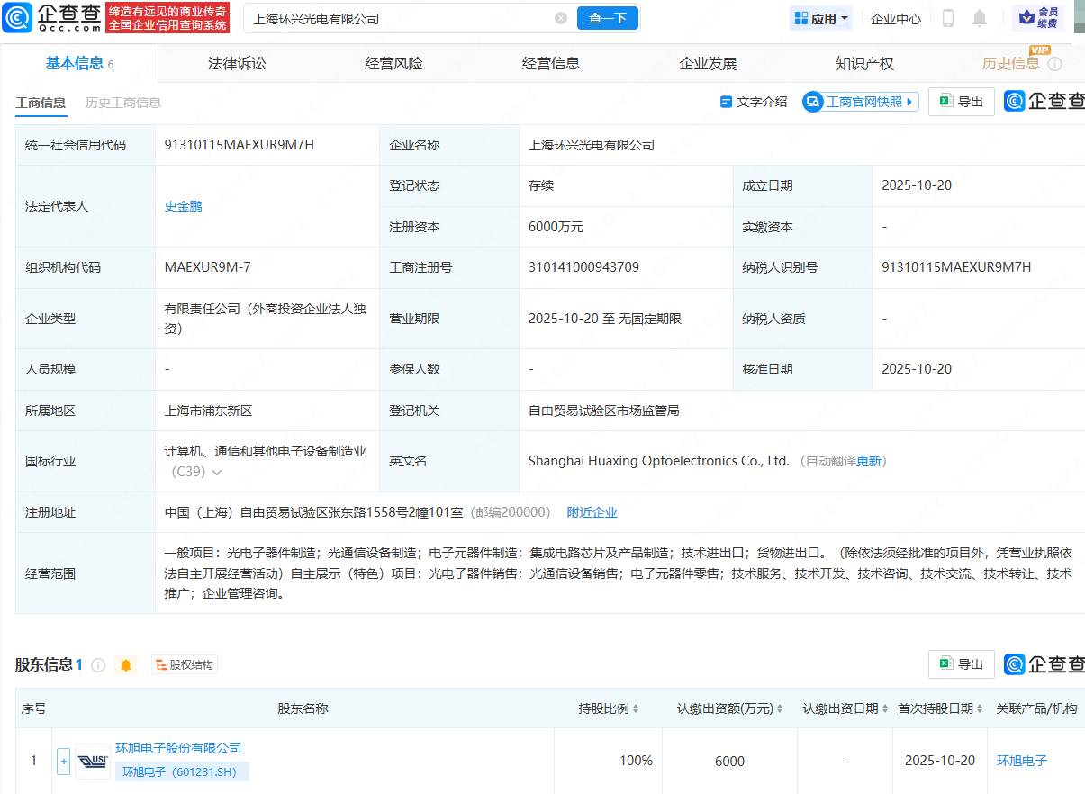 上海环兴光电有限公司成立,法定代表人为史金鹏,注册资本为6000万元广升网,经营范围包含:光电子器件制造;光通信设备制造;电子元器件制造;集成电路芯片及产品制造等。企查查股权穿透显示,该公司由环旭电子(601231)全资持股。